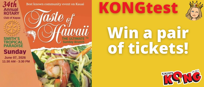 Rules – Winner must be at least 21 years old, a current Kauaʻi resident, and not have won Taste of Hawai’i tickets before. One entry per person per method of entry (call/text/website). Regular KONG 93.5FM (KQNG) and Pacific Media Group contest rules, terms and conditions apply. Deadline to enter is 12 midnight 04/26/2026. Winners announced 04/27/2026 and ontacted by phone, text and/or email.
